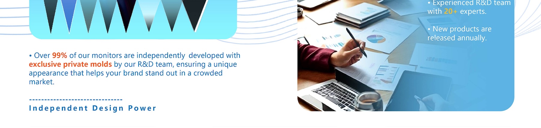 Nossa equipe de P&D desenvolve continuamente designs exclusivos e soluções personalizadas, incluindo monitores OLED para jogos, telas Mini LED de alta faixa dinâmica e tecnologia avançada de luz natural com baixa emissão de luz azul para cuidados com os olhos, em colaboração com instituições líderes como... Universidade de Zhejiang e fabricante de painéis como BOEIsso nos permite oferecer não apenas produção OEM/ODM padrão, mas também soluções personalizadas para atender às demandas específicas do mercado.
