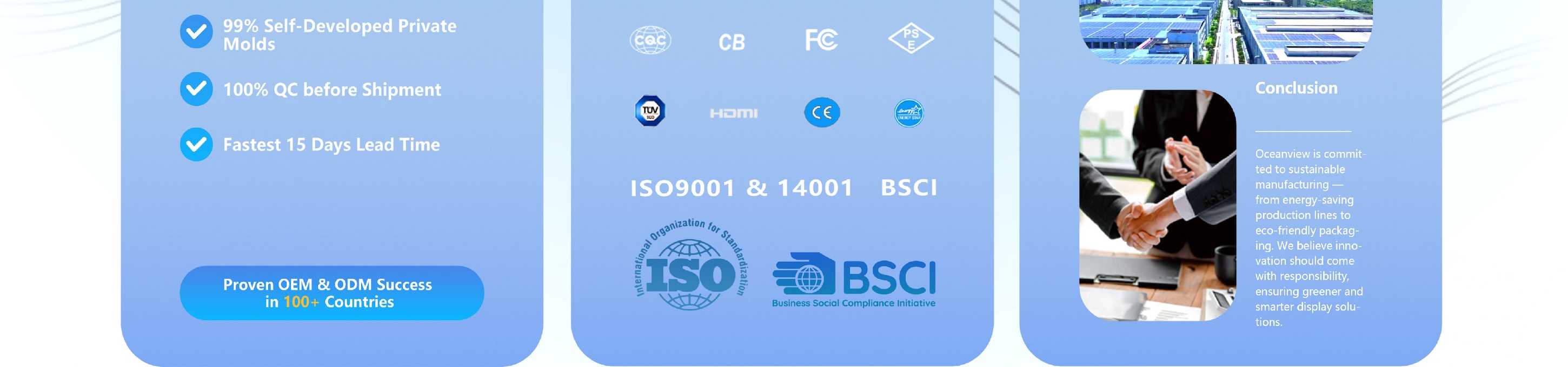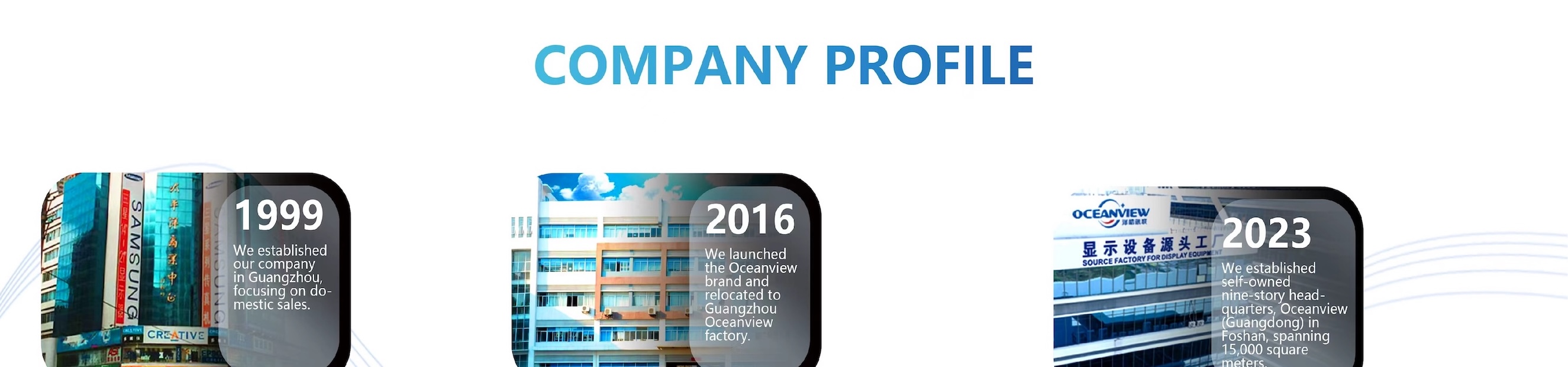Fundada em 2023, a Oceanview (Guangdong) Technology Co., Ltd. herda o legado da Viewg, estabelecida em 1999. Com mais de 25 anos de experiência no setor, somos um fabricante profissional especializado emMonitores LCD/LED/OLED de 17 a 49 polegadas ePCs Barebone All-in-One de 21,5 a 27 polegadasAtendemos tanto clientes OEM/ODM quanto distribuidores globais. Prestamos serviços OEM de longo prazo para marcas renomadas como...AOC, IPASONe muitos outros.