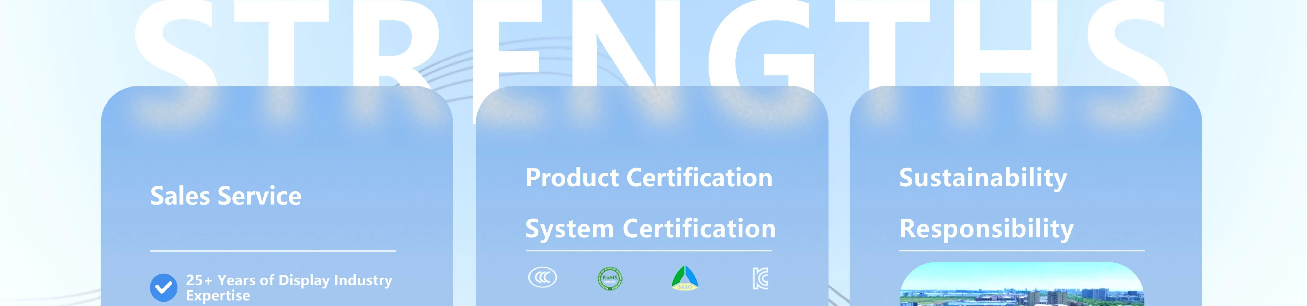 Nossos painéis são provenientes de fornecedores globais líderes, incluindo AUO, BOE, CSOT, HKC e LG, garantindo desempenho consistente e estabilidade no fornecimento. Todos os nossos produtos apresentam alta resolução (até 8K), altas taxas de atualização (até 600Hz), ampla gama de cores, tecnologia de proteção ocular e baixa emissão de luz azul. Para garantir a conformidade internacional, nossa fábrica possui certificação. ISO 9001:2015, ISO 14001:2015, BSCI, embora nossos produtos sejam certificados porCE, CB, RoHS, FCC, KC, KCC e Energy Star, etc.